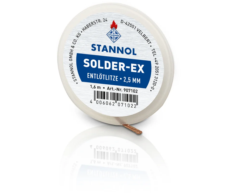 The Solder-Ex desoldering wick has been developed for the repair of solder joints. It consists of a copper braid and is coated with a special halogen-free flux that accelerates solder absorption. The Solder-Ex desoldering wick is available in four widths for different applications.