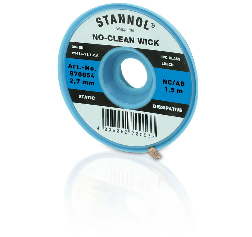The No-Clean desoldering wick has been developed for the safe desoldering and repair of solder joints without the need for subsequent cleaning. The No-Clean desoldering wick is coated with a special halogen-free No-Clean flux that accelerates the speed at which solder is absorbed. Storage in a humid environment does not affect this characteristic. The solder strand remains flexible and does not oxidise.