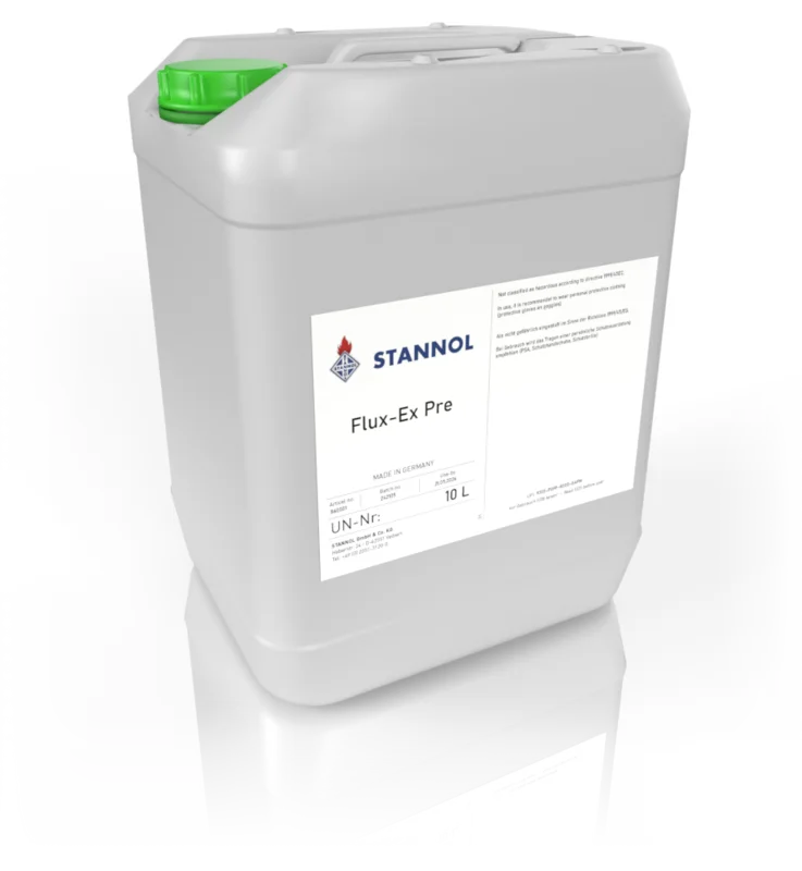 Flux-Ex Pre is an aqueous cleaner for the efficient removal of fluxes before soldering, SMD solder pastes on stencils, unassembled misprints and stencil undersides in screen printers. The cleaner is pH-neutral and quick-drying, making it ideal for the rinsing process.