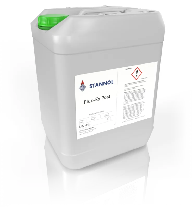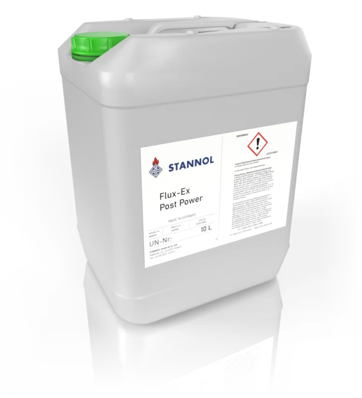 Flux-Ex Post Power is an alkaline broadband cleaner that thoroughly removes flux residues and solder pastes after the soldering process. The high-performance cleaner is particularly suitable for assemblies, hybrids, stencils, misprints, solder frames and carriers as well as machine parts and magazines.