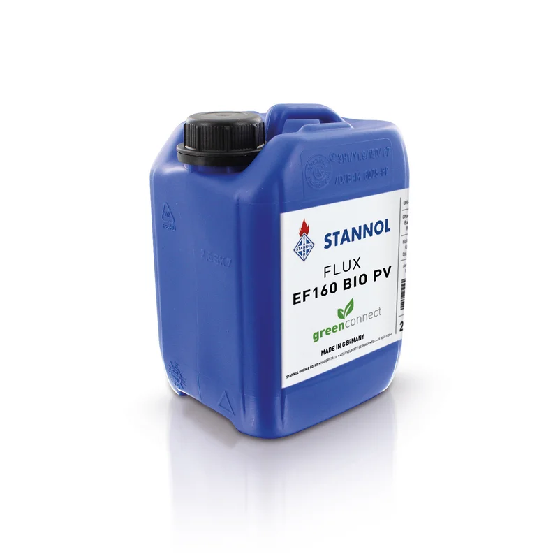 Das Flussmittel EF160 Bio PV ist das neueste Mitglied der nachhaltigen greenconnect-Produktfamilie von Stannol. Speziell für den Einsatz in der Photovoltaik-Modul-Industrie entwickelt, erfüllt das No-Clean-Flussmittel alle Anforderungen der Branche. Das Besondere: Durch den Einsatz nachwachsender Rohstoffe wird eine bessere Ökobilanz als bei herkömmlichen Flussmitteln erzielt – und das bei gleichbleibend hoher Produktqualität.