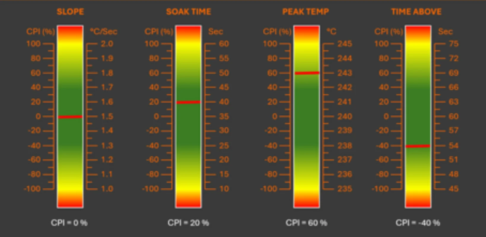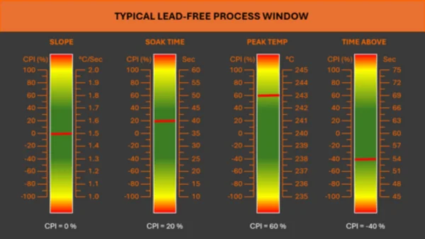 Definieren Sie Prozessfenster zur Kontrolle des Temperaturprofils. Innerhalb dieser Fenster werden Critical Process Indicators (CPIs) festgelegt, die einen Zielbereich und einen exakten Zielwert definieren (z. B. Zeit über Schmelztemperatur: 30-60 Sekunden, Zielwert 45 Sekunden).